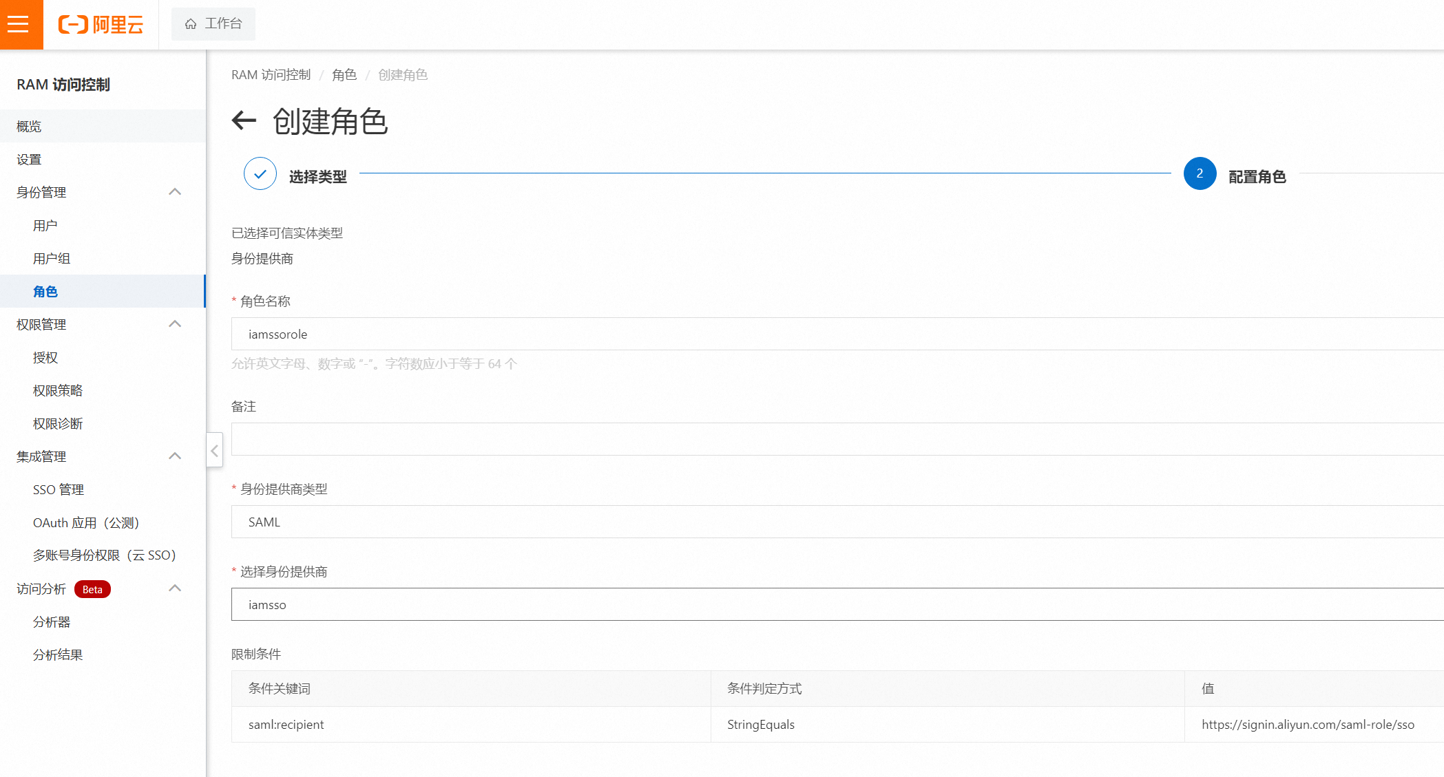 阿里云侧还需要配置一个 角色(Role),与身份提供商进行绑定。