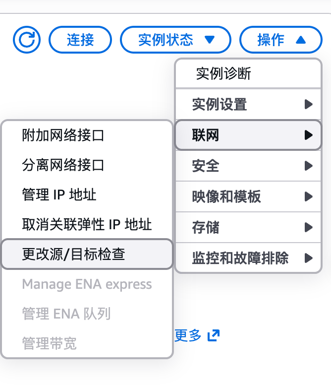 AWS Console → EC2 → 选中实例 → Actions → Networking → Change source/destination check → Stop